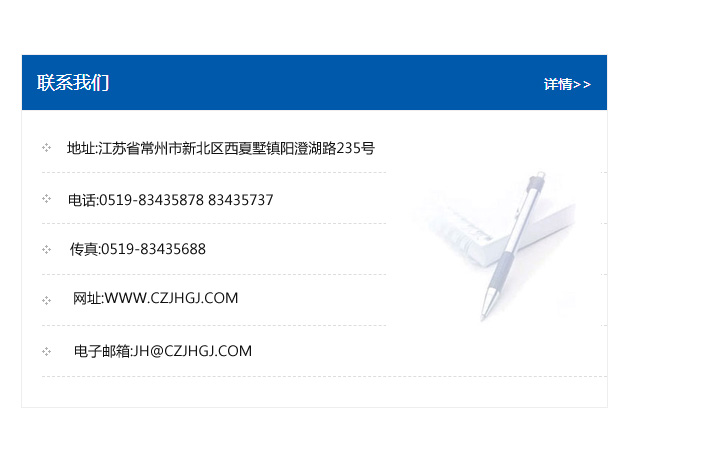 傳真:0519-83435688    郵編:213135    網址:WWW.czjhgj_com.010eye.com    電子郵箱:JH@czjhgj_com.010eye.com